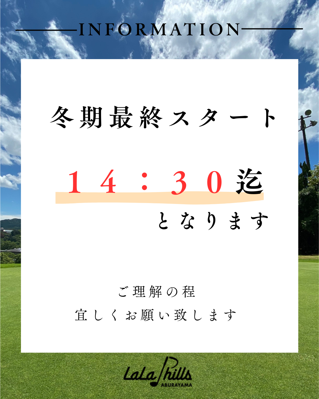 冬期最終スタートは14:30迄とさせて頂きます。